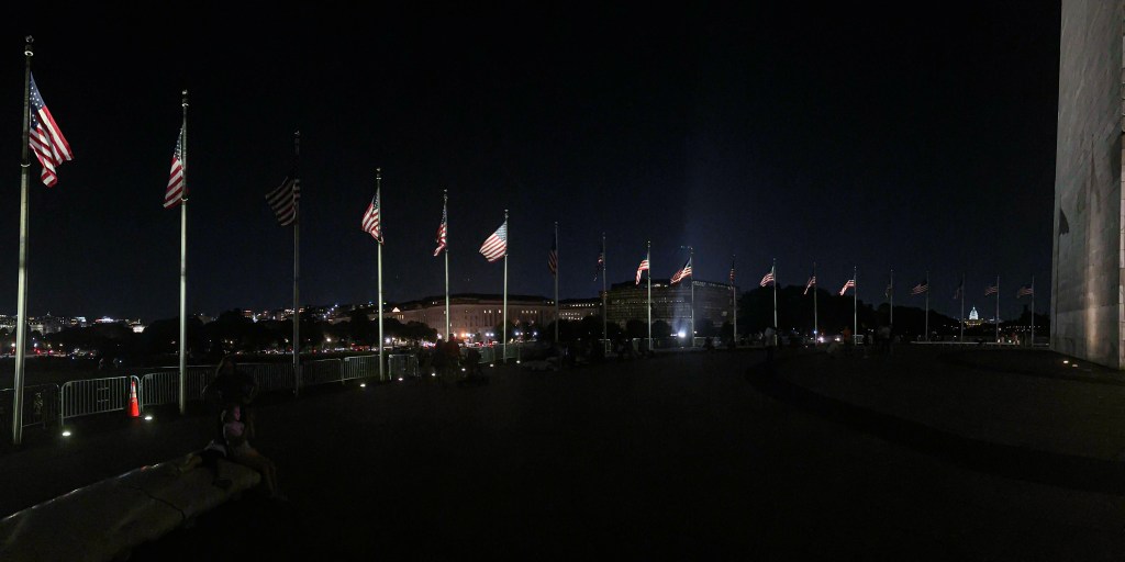 An image that I wanted to make was one that had both the White House (Executive Branch) and the U.S. Capitol Building (Legislative Branch), given that the two branches seem to be fighting over the interpretation of who has the authority to do what, and whether those boundaries were overstepped. I sort of cheated on this photo by using my iPhone’s pano mode because my 24-70mm lens wasn’t wide enough and even the 12mm equivalent on iPhone didn’t have the best outcome. The small point of light on the left above the traffic cone is the south side of the White House and the blue-gray point on the right side adjacent to the Washington Monument’s base is the U.S. Capitol Rotunda.