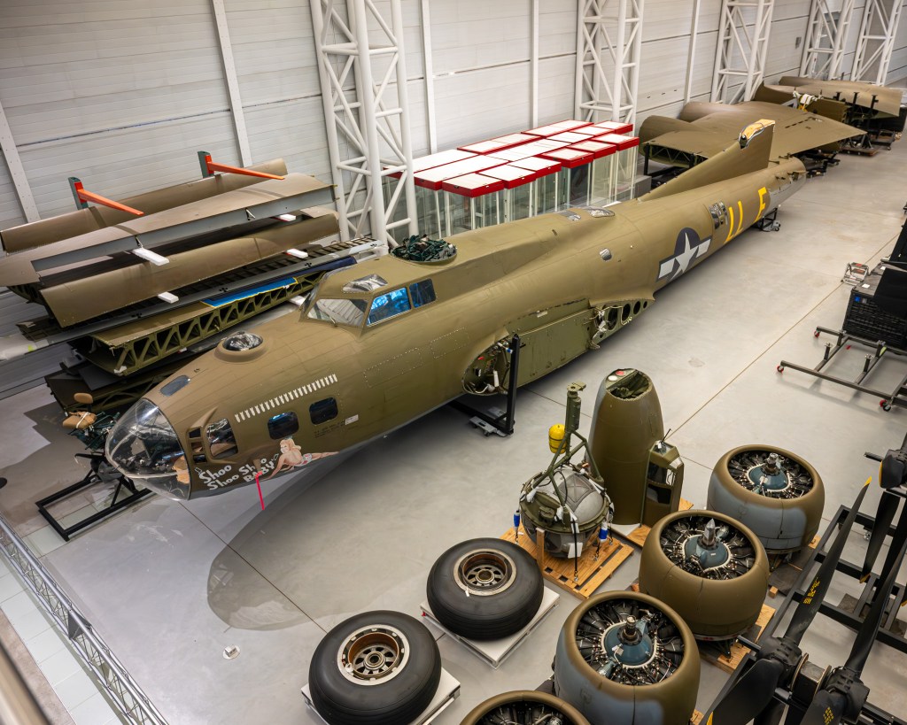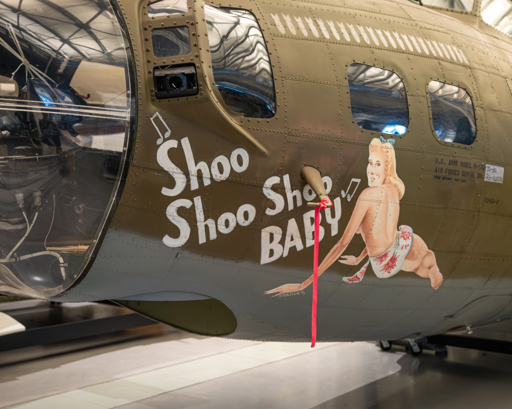 Shoo Shoo Shoo Baby was previously on display at the National Museum of the United States Air Force near Wright-Patterson Air Force Base in Dayton, Ohio, however it was removed from display. That museum put B-17 Flying Fortress, Memphis Belle, on display in 2018. Eventually Shoo Shoo Shoo Baby made its way to the Smithsonian’s Udvar-Hazy Center where it currently awaits reassembly and display.