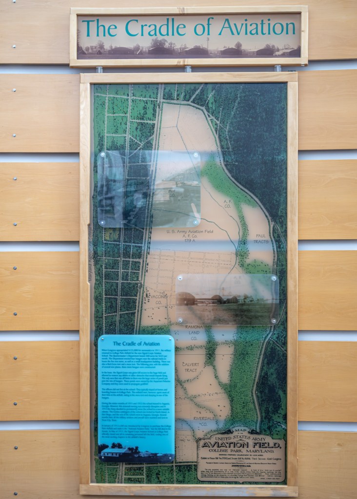Panels in the lobby chronicle the history of the airport and its initial life as the United States Army Aviation Field. This dates back to the Army wanting a more suitable space than Ft. Myer near Arlington, Va. for aircraft landings.