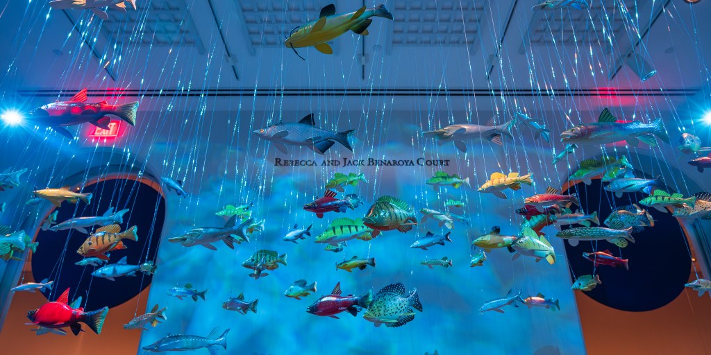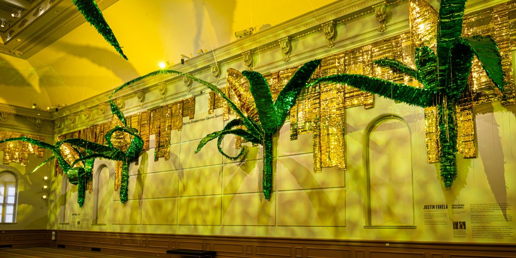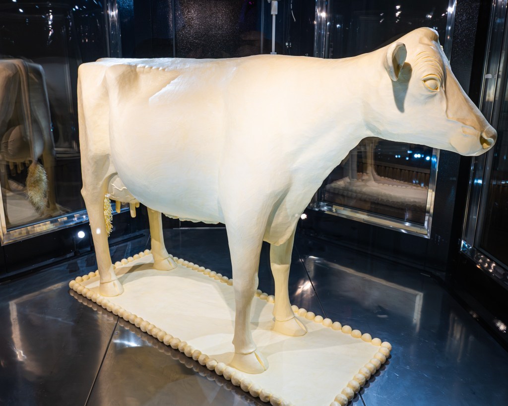 Make sure to visit the second floor to see not only the cow made from butter, but also an activation from Justin Favela with golden walls and pinata corncobs. The neat thing about this space is the lighting for it cycles on a timer. So the room changes from a bluish-purple undertone that combined with the gold and green confetti seems reminiscent of a Mardi Gras color palette to a space illuminated with yellow that seeks to evoke that feeling as if you were in a Midwestern field surrounded by corn.