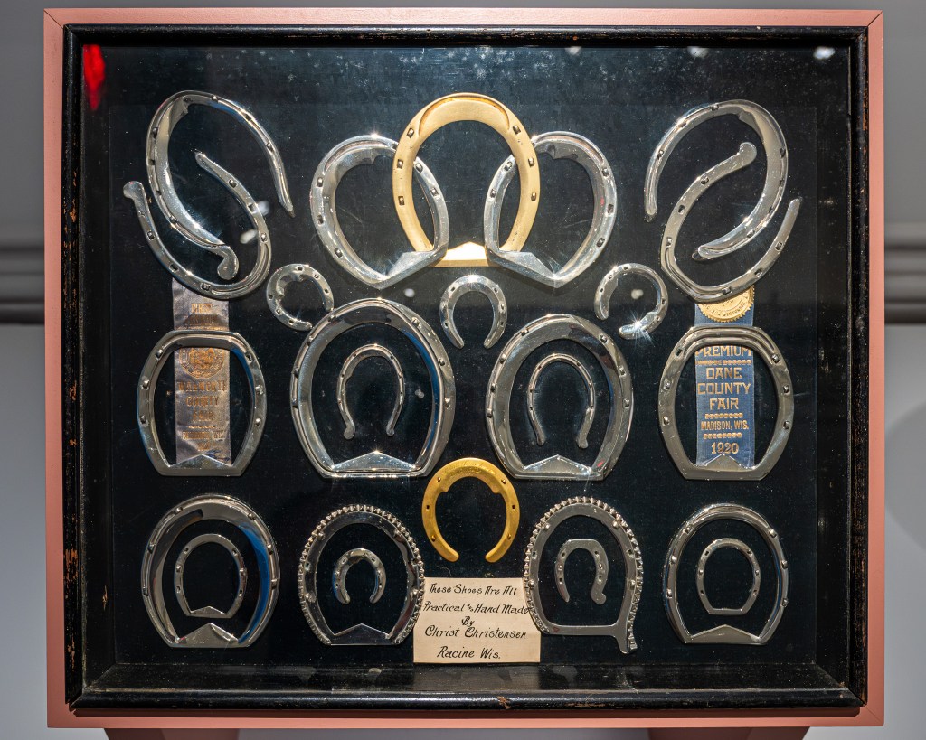 One of the final rooms of the exhibit highlights rodeos and features saddles, a collection of horseshoes from the 1920s and a rhinestone rodeo suit that is reminiscent of nudie suits made popular by country music artists like Hank Williams Sr. or Little Jimmy Dickens.