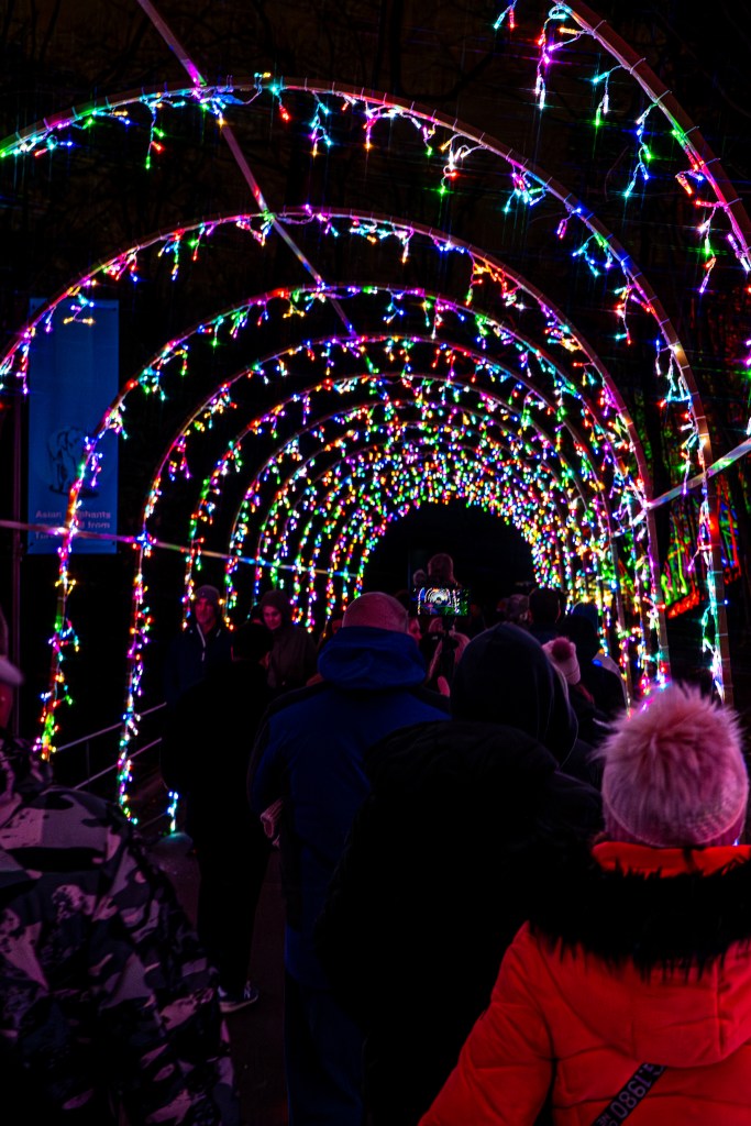 Zoo Lights is something that the National Zoo puts on every season and I don’t think I have ever seen the inside without a crowd. (Perhaps if you buy a ticket when it’s supposed to rain yet the weather holds out long enough for staffers to keep it going.) Anyway, pack your patience especially if you’re driving and have to park in the zoo lot. There was a line of cars but luckily I walked down from Cleveland Park so my wait time was fairly short at the pedestrian entrance.